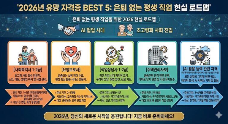 2026년 유망 자격증 BEST 5🚀 인생 2막 로드맵 은퇴 걱정 끝! 평생 돈 버는 기술을 소개합니다 안녕하세요! 여러분의 꿈을 응원하는 ‘내일의 자격증’입니다! 👋 요즘 뉴스를 보면 참 마음이 복잡해집니다. “AI가 인간의 일자리를 대체한다”, “준비 없는 100세 시대는 축복이 아니라 재앙이다”…